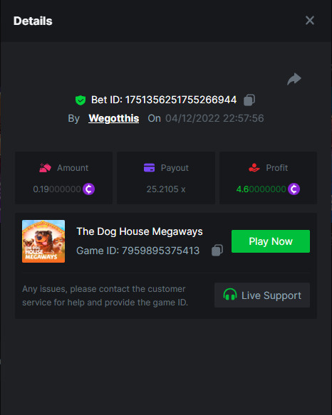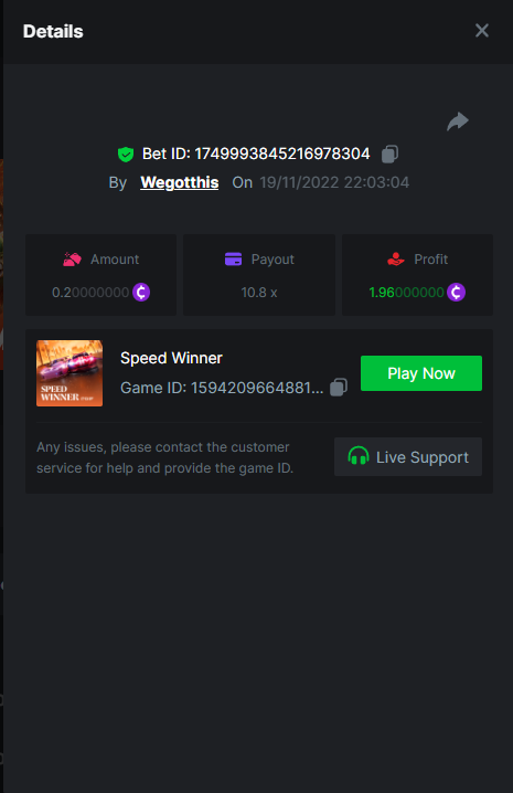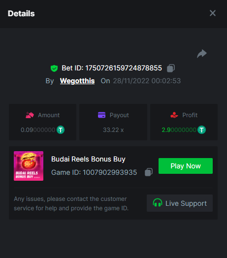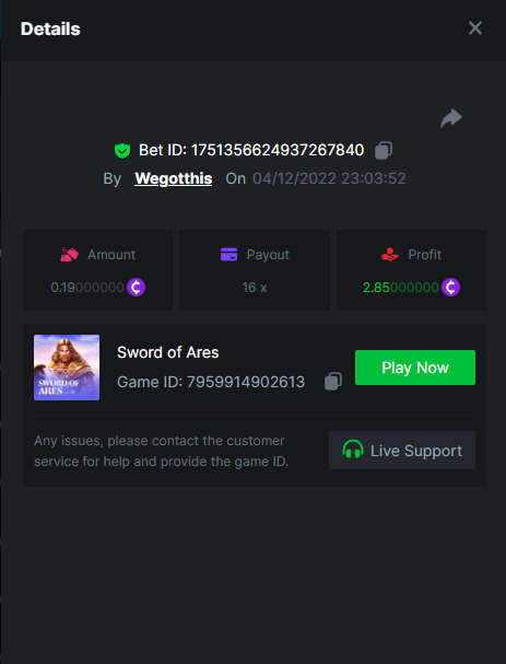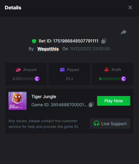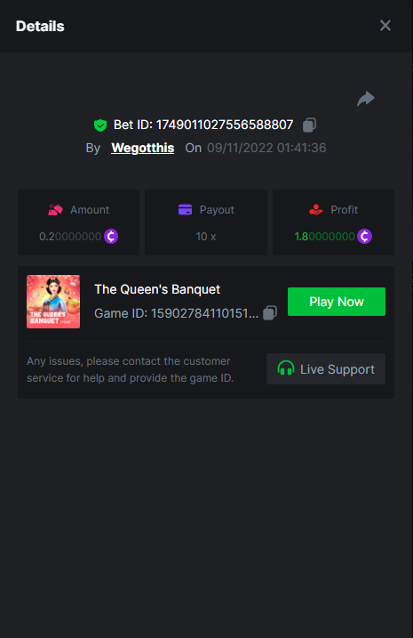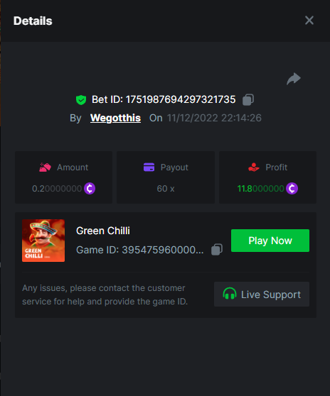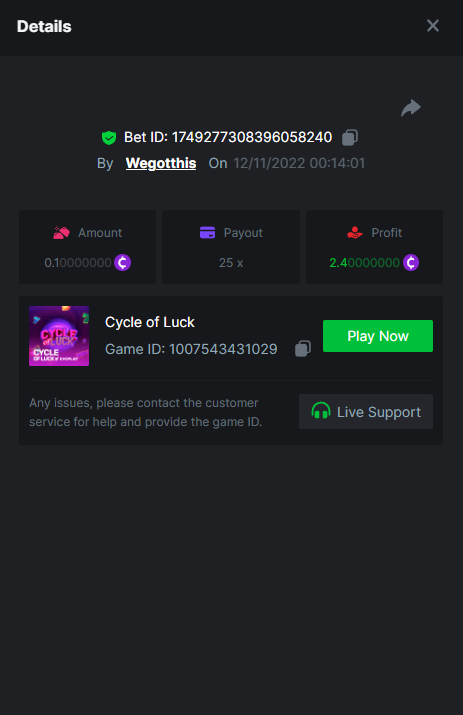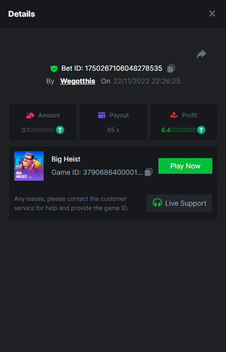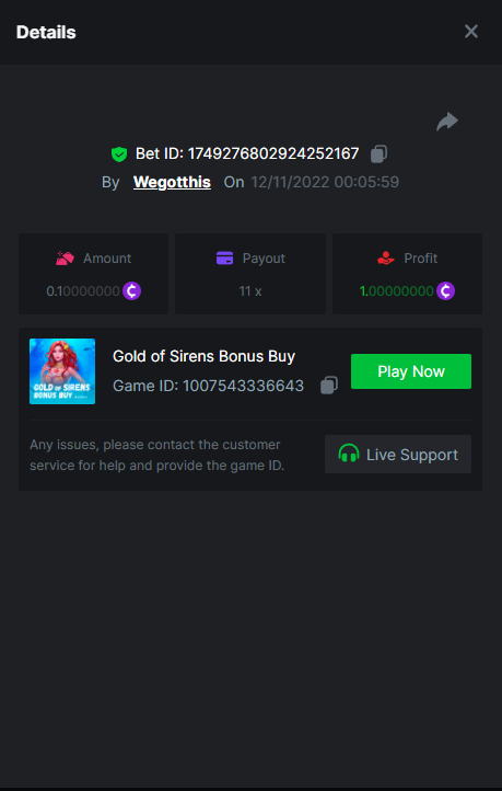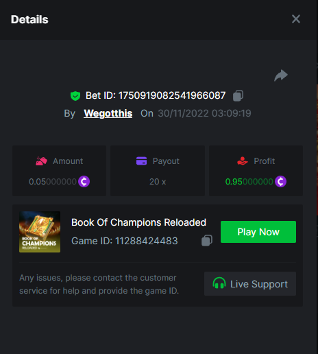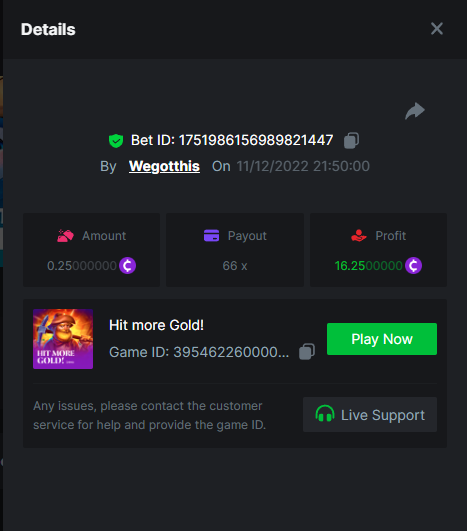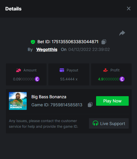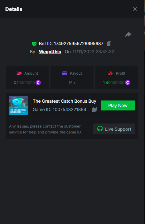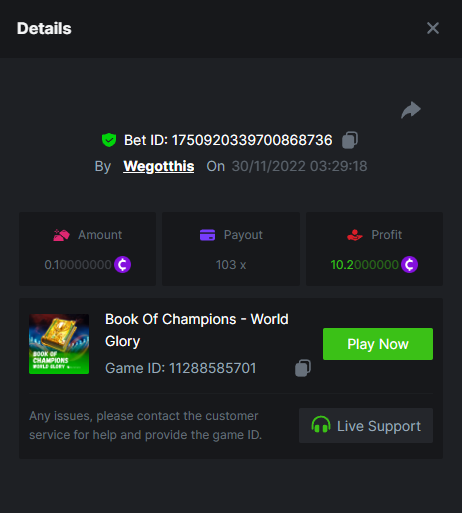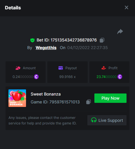 3. https://bc.game/#/sd/10YLHMO9FMMHW3 https://bc.game/#/sd/10YLI16E0IO0LV https://bc.game/#/sd/10YLIEX5ZDW9OZ I don't know why the bet ID shows 1 cent less per bet, while it's 10 cents on the provider's page. This would have made me eligible for bounty with exactly 50x. Look at screenshot below for example. https://bc.game/#/sd/10YLIV09L2KW7N https://bc.game/#/sd/10YLJADSJL3L77 https://bc.game/#/sd/10YLJI9Y61ZCIB https://bc.game/#/sd/10YLJVIP8441ZN https://bc.game/#/sd/10YLK4I9DYJAJ7