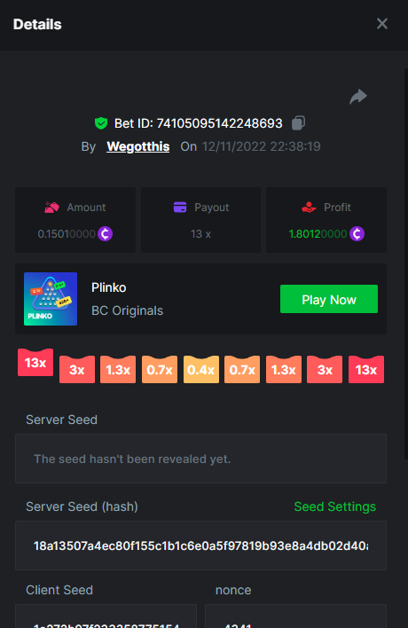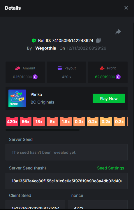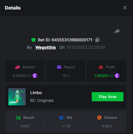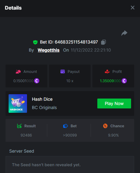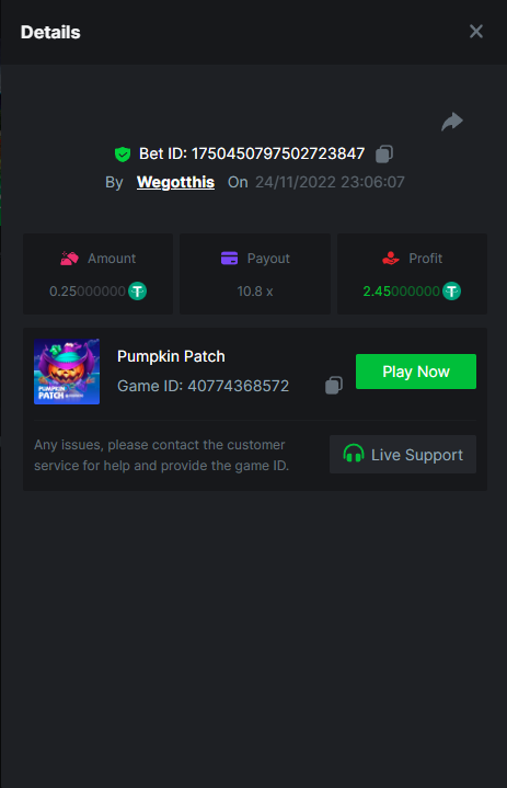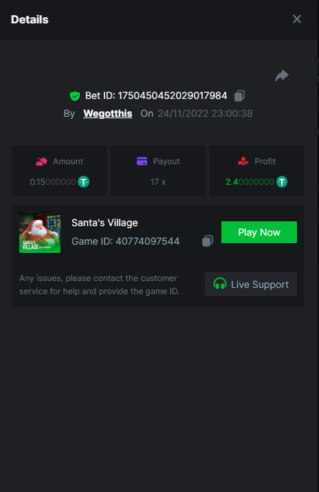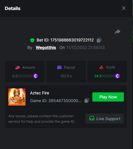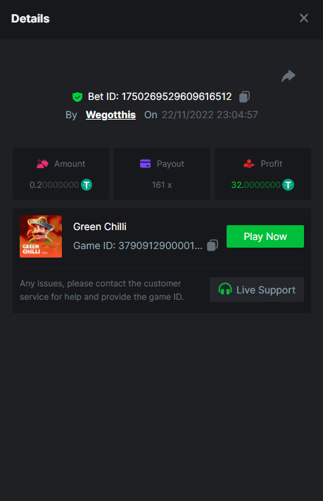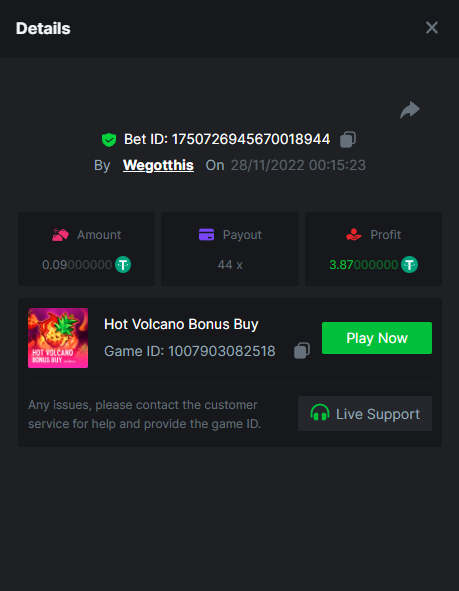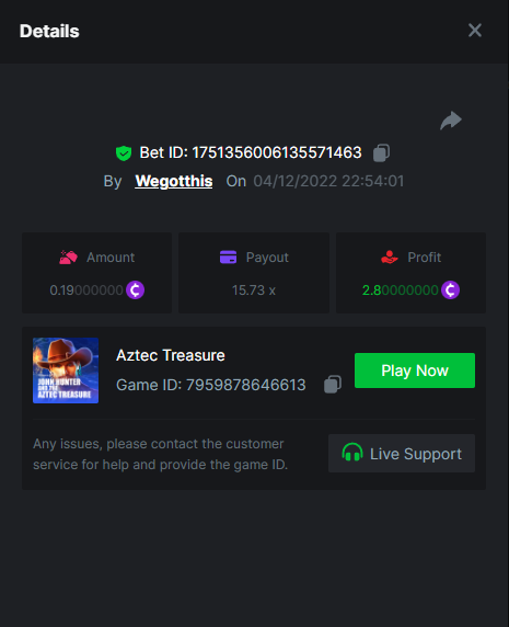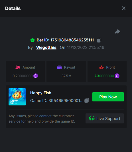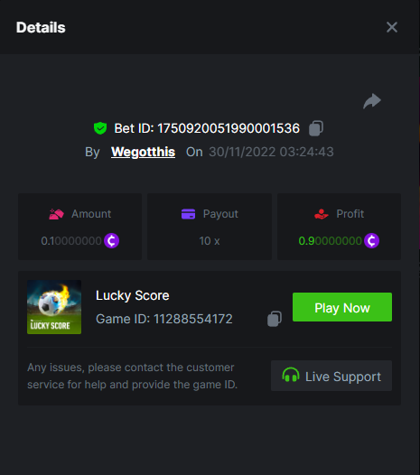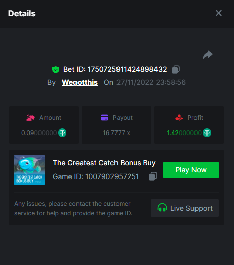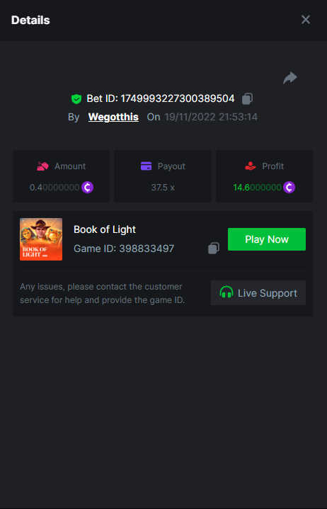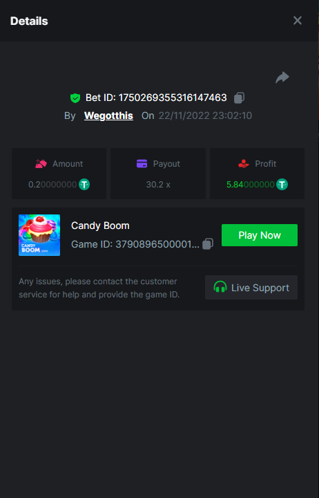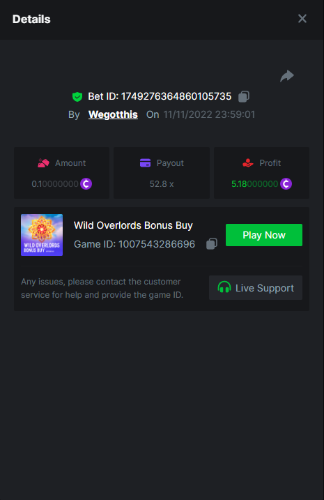 3. https://bc.game/#/sd/10YLHMO9FMMHW3 https://bc.game/#/sd/10YLI16E0IO0LV https://bc.game/#/sd/10YLIEX5ZDW9OZ I don't know why the bet ID shows 1 cent less per bet, while it's 10 cents on the provider's page. This would have made me eligible for bounty with exactly 50x. Look at screenshot below for example. https://bc.game/#/sd/10YLIV09L2KW7N https://bc.game/#/sd/10YLJADSJL3L77 https://bc.game/#/sd/10YLJI9Y61ZCIB https://bc.game/#/sd/10YLJVIP8441ZN https://bc.game/#/sd/10YLK4I9DYJAJ7
