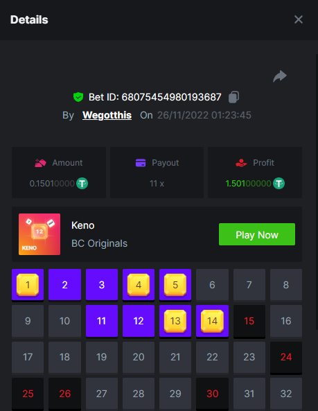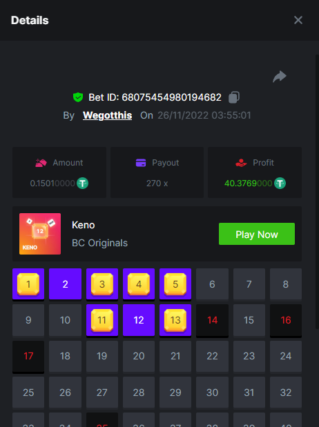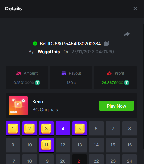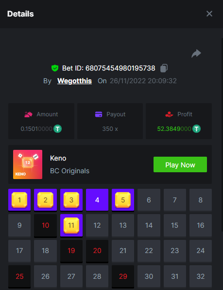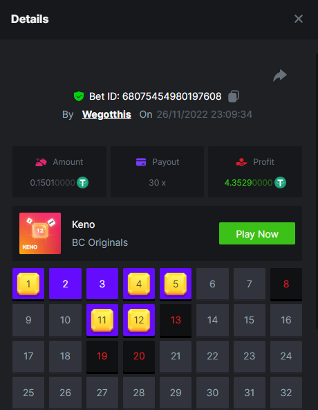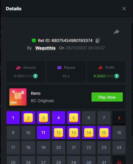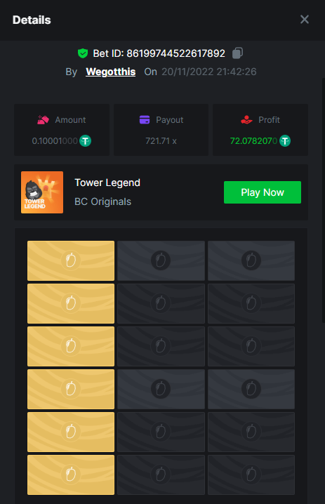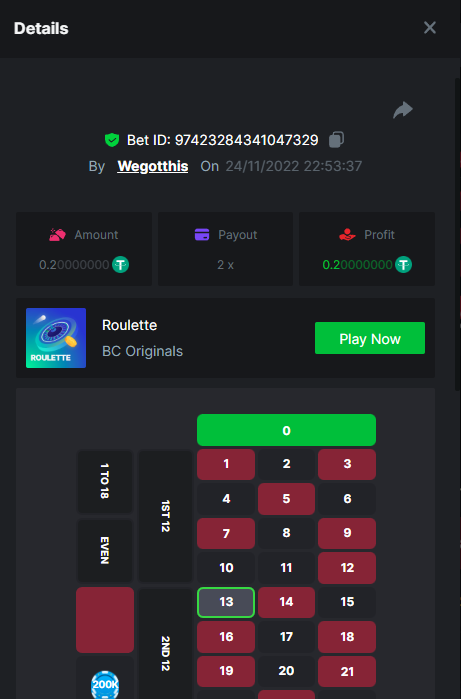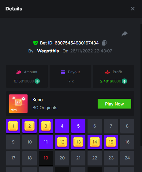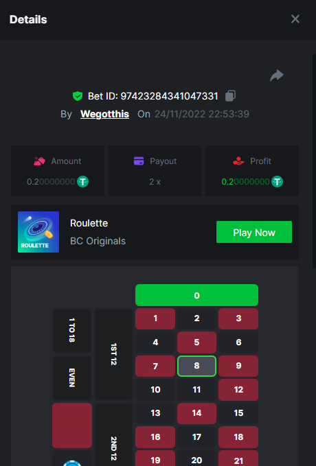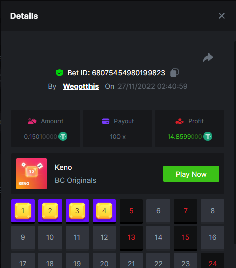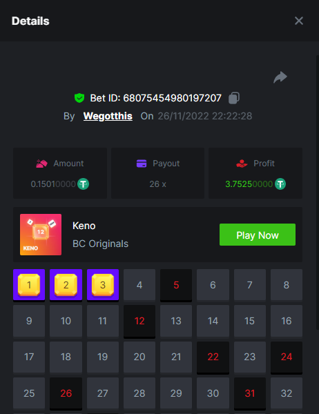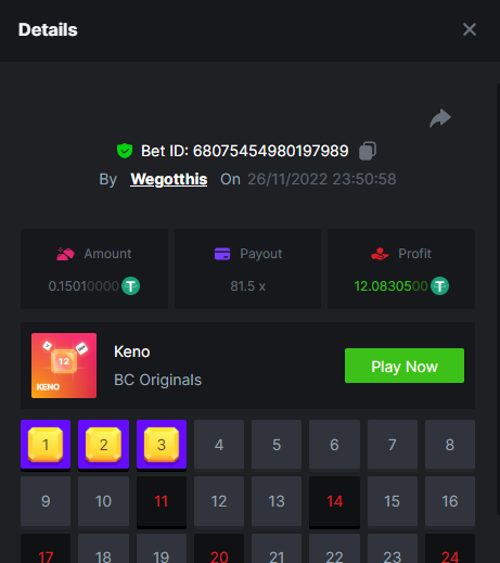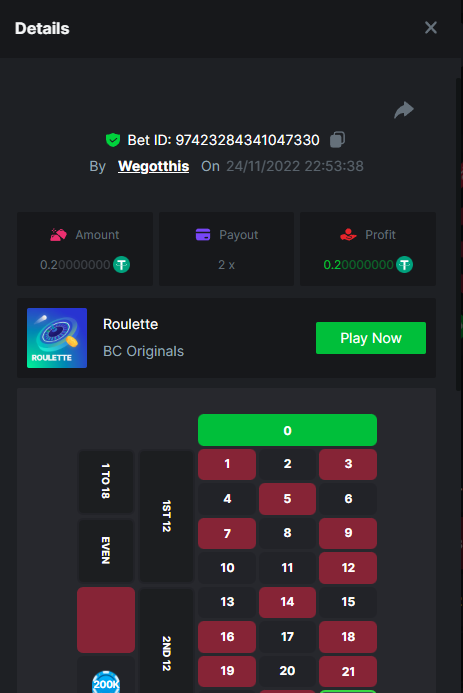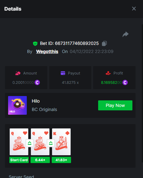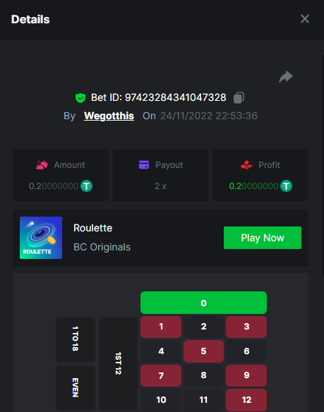 3. https://bc.game/#/sd/10YLHMO9FMMHW3 https://bc.game/#/sd/10YLI16E0IO0LV https://bc.game/#/sd/10YLIEX5ZDW9OZ I don't know why the bet ID shows 1 cent less per bet, while it's 10 cents on the provider's page. This would have made me eligible for bounty with exactly 50x. Look at screenshot below for example. https://bc.game/#/sd/10YLIV09L2KW7N https://bc.game/#/sd/10YLJADSJL3L77 https://bc.game/#/sd/10YLJI9Y61ZCIB https://bc.game/#/sd/10YLJVIP8441ZN https://bc.game/#/sd/10YLK4I9DYJAJ7