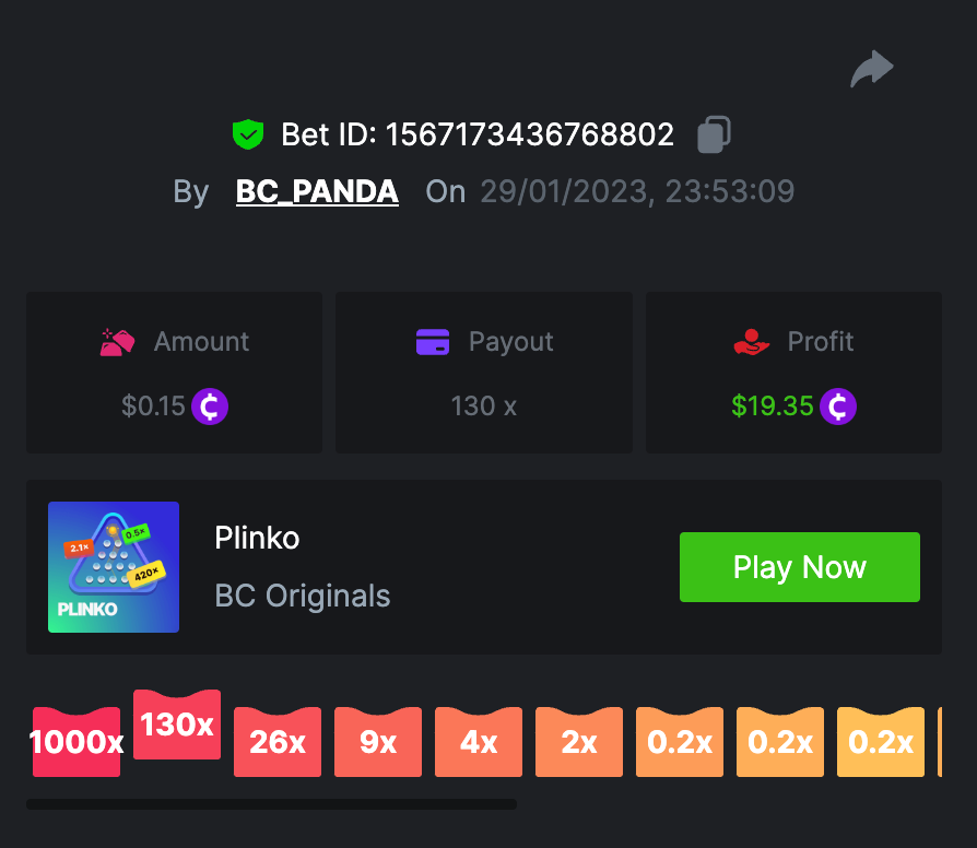 $1.5k Prestige Plinko Challenge #82 DURATION: 30th MAR - 3rd APR 15:30 pm UTC Hey, hey, VIPs! Look to the Sky, It's Raining METEORS, and they are closing in fast! Hit the highest number of unique payouts on Plinko to save yourself, and get your join in BCRocket to explore a new undiscovered planet. The Prize pool is $1,500 of which $250 will be for all rest participants who meet the requirement. Get ready! Keep reading more information below to find out the rules of this challenge and how you can take home the first prize! What's the Challenge? Complete as many of the following 17 payouts on Plinko. Must be an exact multiplier. | 11x | 13x | 22x | 29x | 33x | 37x | 43x | 56x | 76x | 83x | 110x | 120x | 170x | 260x | 420x | 620x | 1000x | Each payout you hit above counts as 1 point (Maximum 1 point for each payout). If there is a tie, the player with the higher average bet amount (in USD) shall be the winner. If there is a tie, the player with the higher average bet amount (in USD) shall be the winner. If there is a tie in the amount and payout, the one who posted or edited his post first will be considered in the Ranking. How to Enter To enter, copy the link of the bet you'd like to submit. Once you've copied it, paste it as a reply to this thread like so: Link: https://bc.game/#/sd/112F09EO4FE0PF In the same post, upload a screenshot of your win by clicking the game ID WITH VIEW IN USD mode ENABLED (accessible at the bottom of dropdown menu for your wallet up top. This way, we can ensure that your bet indeed met the minimum requirement at the time of placing it: LINK: https://bc.game/#/sd/112F09EO4FE0PF Minimum VIP There's no minimum VIP level Minimum Payouts Hit at least 3 payouts to qualify Minimum Bet Size $0.15 USD equivalent Eligible Coins All cryptocurrencies are eligible (excepting JB) Available Prizes Positions 1st 2nd 3rd 4th 5th 6th-10th 11th-20th 21+ Prizes $500 $250 $125 $75 $50 $125 $125 $250 GENERAL TERMS Please combine all of your hits together in a SINGLE post. Edit your existing post for additional hits, don't create a new post. Each eligible entry must have the Bet Slip URL, failure to include it will disqualify participation in the event. Bet Slip image is not mandatory. Bets must be posted within 24 hours of placing bet in order to keep things fair for everyone. Bets must be made during the specified time window stated above. This thread will lock automatically when the time period is over. One (1) entry per household. Anyone found attempting to win multiple prizes will be disqualified from this challenge as well as all future challenges. Failure to follow instructions will result in your submission being null and void. By entering this challenge, you acknowledge that BC.Game has the final decision on results and placement. Payouts will be made within 72 hours of challenge completion, please be patient, we promise you that we haven't forgotten. We check and double check to make sure the rightful winners receive their prize. Prizes will be paid out in BCD.