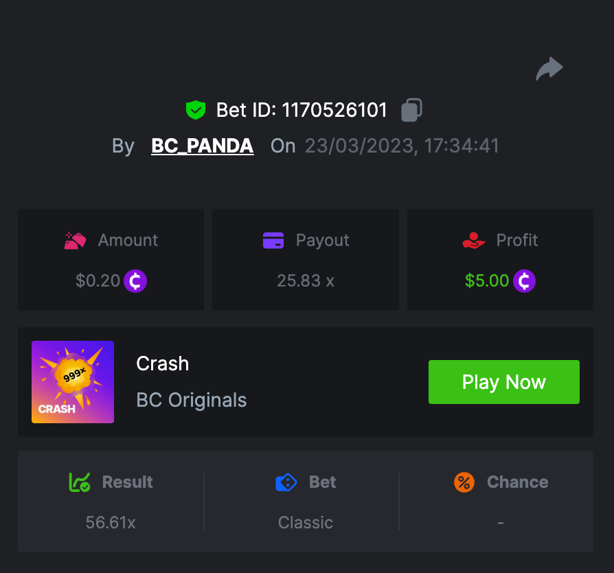 $1.5k Prestige Crash Challenge #80 DURATION: 23rd MAR - 27th MAR 14:00 pm UTC Hey Everybody! We want to finish this week with our in-house Crash game. The Prize pool is $1,500 of which $250 will be reserved for the extra bonus. Get ready! Keep reading more information below to find out the rules of this challenge and how you can take home the first prize! What's the Challenge? Win the highest multiplier you can on BC.Game's in-house game, Crash. If there is a tie, the player with the higher average bet amount (in USD) shall be the winner. If there is a tie in the amount and payout, the one who posted or edited his post first will be considered in the Ranking. How to Enter To enter, copy the link of the bet you'd like to submit. Once you've copied it, paste it as a reply to this thread like so: Link: https://bc.game/#/sd/1161RODDK14GLV In the same post, upload a screenshot of your win by clicking the game ID WITH VIEW IN USD mode ENABLED (accessible at the bottom of dropdown menu for your wallet up top. This way, we can ensure that your bet indeed met the minimum requirement at the time of placing it: Link: https://bc.game/#/sd/1161RODDK14GLV Minimum VIP There's no minimum VIP level Minimum Payouts Minimum payout to qualify is 20x Minimum Bet Size $0.2 USD equivalent Eligible Coins All cryptocurrencies are eligible (excepting JB) Available Prizes Positions 1st 2nd 3rd 4th 5th 6th-10th 11th-20th Bounty Prizes $500 $250 $125 $75 $50 $125 $125 $250 EXTRA BOUNTY Share a winning bet with 500x multiplier or above and receive an equal share of the $250 prize pool! Original rules apply with all minimum requirements. GENERAL TERMS Please combine all of your hits together in a SINGLE post. Edit your existing post for additional hits, don't create a new post. Each eligible entry must have the Bet Slip URL, failure to include it will disqualify participation in the event. Bet Slip image is not mandatory. Bets must be posted within 24 hours of placing bet in order to keep things fair for everyone. Bets must be made during the specified time window stated above. This thread will lock automatically when the time period is over. One (1) entry per household. Anyone found attempting to win multiple prizes will be disqualified from this challenge as well as all future challenges. Failure to follow instructions will result in your submission being null and void. By entering this challenge, you acknowledge that BC.Game has the final decision on results and placement. Payouts will be distributed after the event is finished. Please note that it could take anywhere between 24 hours to 7 days after the completion of the event.