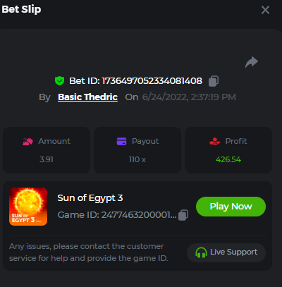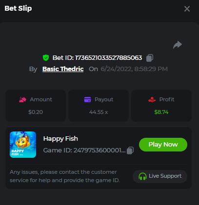Multiplier: 100X Bet: $0.4096 Bounty: Yes Glad this didn't take too long. I'm not a fan of this game. IMO the bounty is silly for this one. Too easy. As can be seen by how many ppl on page 1 alone got it. Just my $.02 https://bc.game/sd/?sd=10TEPGQMJ45HCJ And the bounty https://bc.game/sd/?sd=10TEOAK0JLFOCZ -