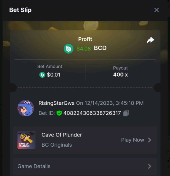 Moderator Giandreas Posted December 14, 2023 Moderator Share Posted December 14, 2023 Read Carefully Before Start To Hunt Forum Daily Challenges #448Hunt : Cave of Plunder Win the highest pay out Min Payout : x17 Min Level 10️Duration Starting : Now End time : 23.59 UTC Time How to Join? Make screenshot + paste your bet link + UID or Profile link Any coin, with min bet 0.01 USD is allowed (jb/bb/bcl not allowed)Reward Prizes 1st Place.....$7 BCD 2nd Place.....$5 BCD 3rd Place.....$4 BCD 4th Place.....$3 BCD 5th Place.....$2 BCD 🏵 Winners will be announcing next day after Roll Point! Link to comment Share on other sites More sharing options...